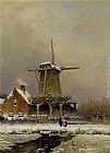 Figures by a windmill in a snow covered landscape by Louis Apol