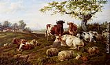 Resting Cattle, Sheep And Deer, A Farm Beyond by Charles Jones