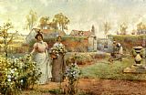 A Lady And Her Maid Picking Chrysanthemums by Alfred Glendening