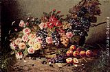Still Life Of Roses, Peaches And Grapes In A Basket by Modeste Carlier