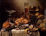 Banquet Still Life With A Crab On A Silver Platter, A Bunch Of Grapes, A Bowl Of Olives, And A Peeled Lemon All Resting On A Draped Table by Pieter Claesz