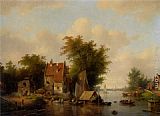 A river landscape with many figures by a village by Jacobus Van Der Stok