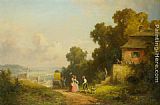 Figures and a Carriage on a Path with a Village Beyond by Willy Moralt
