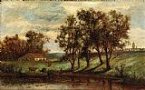 man with cows grazing near pond with house and trees in background by Edward Mitchell Bannister