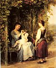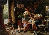 A Young Girl feeding Baby Chicks by Francois Alfred Delobbe