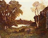 Goats grazing beside a lake at sunset by Henri-Joseph Harpignies
