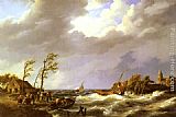 Dutch Fishing Vessel caught on a Lee Shore with Villagers and a Rescue Boat in the foreground by Johannes Hermanus Koekkoek