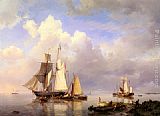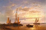 Vessels at Anchor in an Estuary with Fisherman hauling up their rowing boat in the Foreground by Hermanus Koekkoek Snr