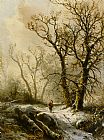 A Figure in a Snowy Forest Landscape by Pieter Lodewijk Francisco Kluyver