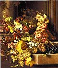 Still Life with Black Grapes, a Strawberry, a Peach and Gooseberries on a Mossy Bank by Oliver Clare