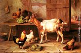 Goat and chickens feeding in a cottage interior by Edgar Hunt