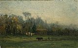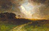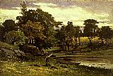 landscape, boat moored near stream, man walking in foreground by Edward Mitchell Bannister