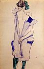 Standing Girl in a Blue Dress and Green Stockings Back View by Egon Schiele