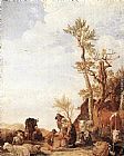 A rural landscape with peasants and a drover by a track, a village beyond by Jan van Goyen