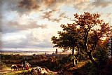 A Panoramic Rhenish Landscape With Peasants Conversing On A Track In The Morning Sun by Barend Cornelis Koekkoek