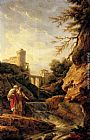 Two female peasants by a waterfall, a town and aqueduct beyond by Claude-Joseph Vernet