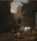 Peasants Playing Cards by a White Horse in a Rocky Gully by Philips Wouwerman
