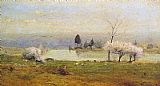 man with cows grazing near pond with house and trees in background by Edward Mitchell Bannister