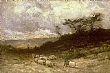 A Shepherd and his Flock on a Path in Winter by Wright Barker