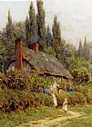 Children On A Path Outside A Thatched Cottage, West Horsley, Surrey by Helen Mary Elizabeth Allingham