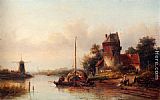 A River Landscape In Summer With A Moored Haybarge By A Fortified Farmhouse by Jan Jacob Coenraad Spohler