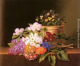 Apple Blossoms, Lilac, Violas, Cornflowers and Primroses on a Ledge by Johan Laurentz Jensen
