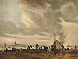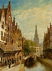 View of a town with figures strolling on a quay by Johannes Franciscus Spohler